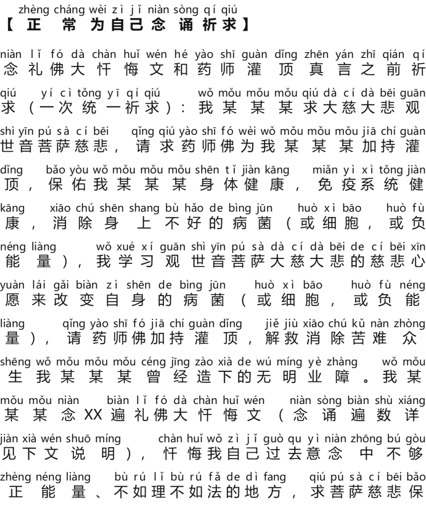 Saya XXX memohon Guan Shi Yin Pu Sa yang maha welas asih berwelas asih, memohon Yao Shi Fo memberikan siraman berkat kekuatan kepada saya XXX, memberkati saya XXX untuk bertobat atas kesalahan saya, memberikan saya kesempatan untuk mengubah dari kesalahan, sehingga dapat mengurai guna-guna ini, saya meneladani tekad welas asih dari Guan Shi Yin Pu Sa yang maha welas asih untuk mengubah energi negatif yang ada di tubuh diri saya sendiri, mohon Yao Shi Fo memberikan siraman berkat, menolong saya XXX makhluk yang menderita ini untuk menghapus halangan karma buruk atas ketidaktahuan saya. Mohon Guan Shi Yin Pu Sa memberkati saya XXX dan jauhkan saya dari energi negatif ini, saya melafalkan 108 kali paritta Li Fo Da Chan Hui bertobat kesalahan saya, mohon Pu Sa berwelas asih memberkati agar proses penyiraman berkat bagi saya dapat berhasil, memberkati saya sehingga tubuh dan pikiran tidak terpengaruh oleh energi negatif dan kekuatan guna-guna dari luar.
